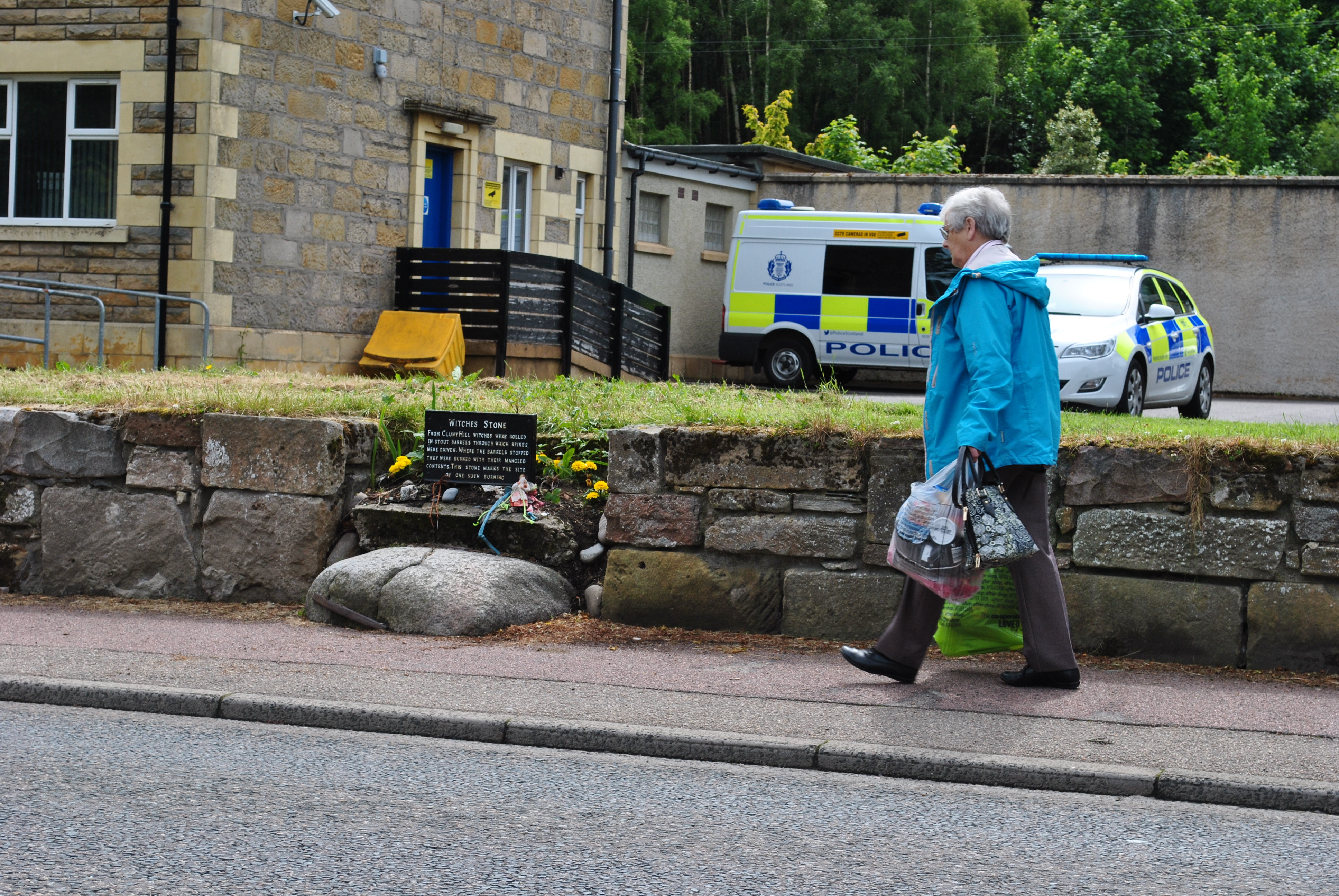 Not in a cavern with a boiling cauldron in the middle, not on a wild eerie heath but right in the present everyday normality in front of Forres’ police station: evidence not only of magic but also of murder.