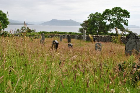 St. Columba landed at Kilmore in the 6th century and blessed the ground already a sacred place since the druids. The old church that dates back to 1681 lies in ruin now, the graveyard still in the summer sun. This is the traditional burial place of the Macdonalds of Sleat, the early chiefs were buried on Iona, the graveyard of the kings.