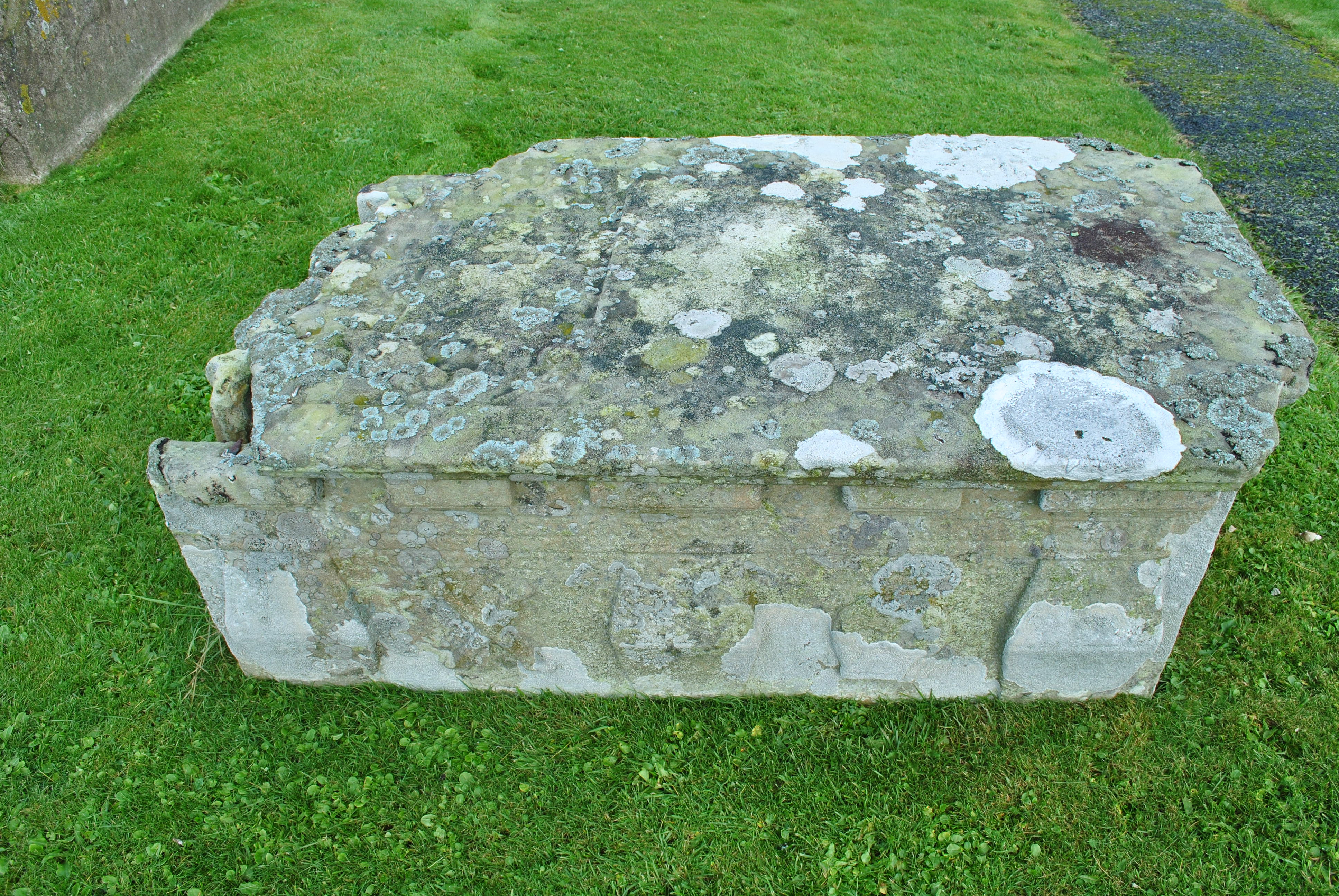 There is also, nearby in the churchyard, an elaborate 17th-century stone sarcophagus, carved with two shields for Mitchell and Umphray and emblems of mortality in relief Oohn Mitchell and his wife Jean Umphray). Elegiac couplets on both long sides read: