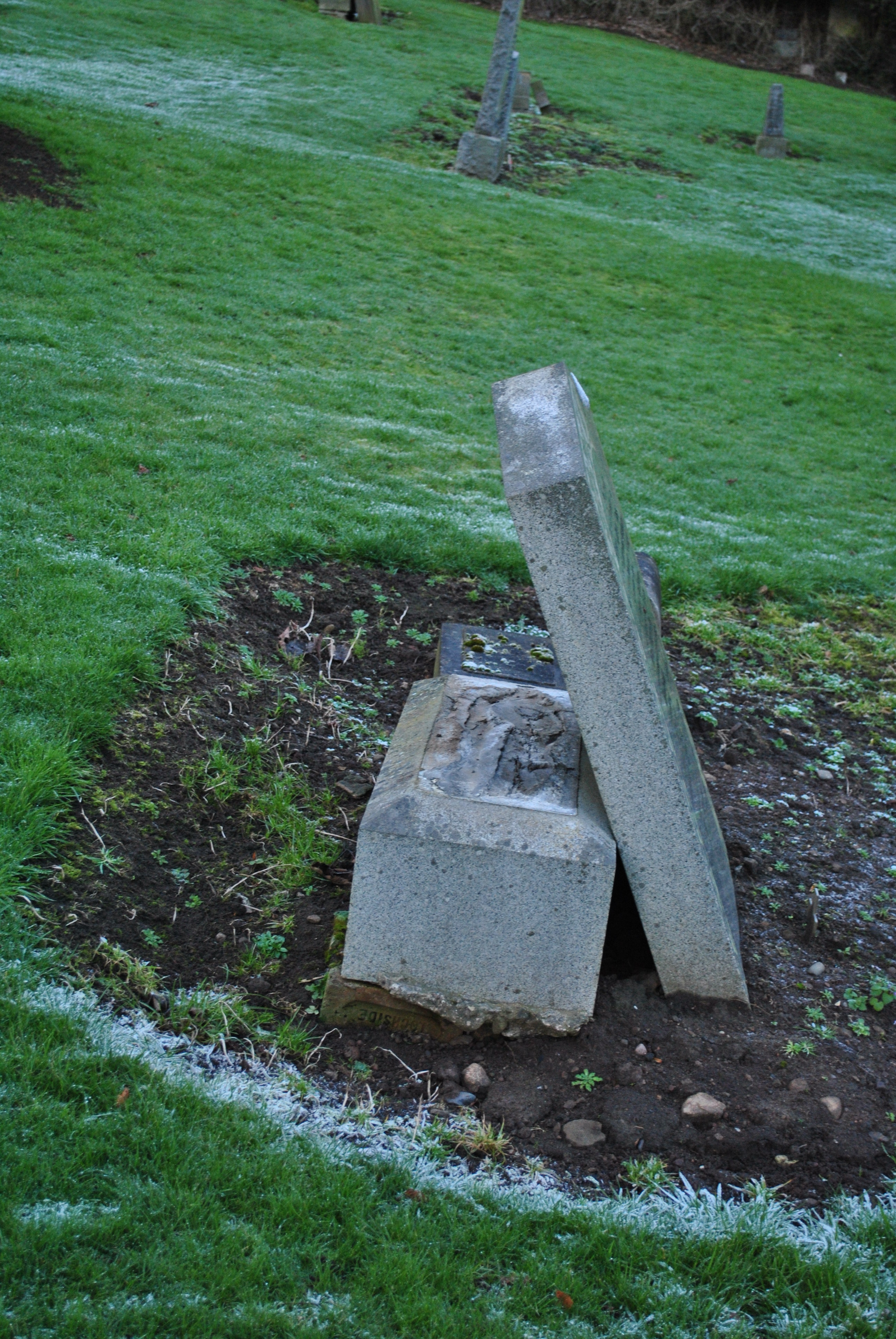 Inverkeithing in Fife has now tackled the problem, too. The graveyard in Hope Street spreads on a slope which heightens the danger of a heavy headstones toppling over. Safety inspections began early 2017 and in 2019 a large number of headstones (considerable smaller than the one in Glasgow but still heavy and potentially dangerous) have been made safe by cutting them and securing them on the ground.
