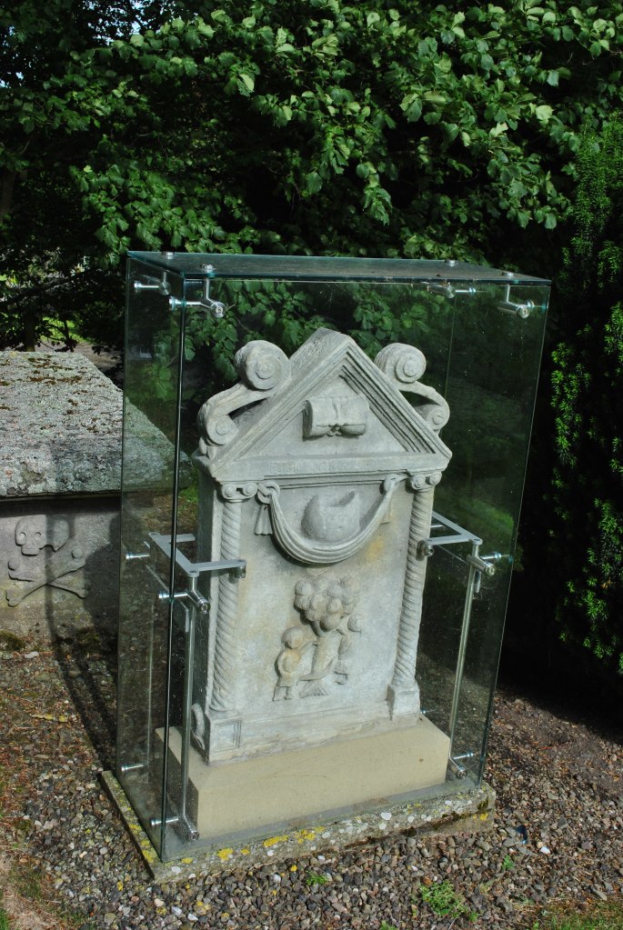 Adam and Eve stones are rarely seen in Scotish graveyards anymore. They are old and have now either deteriorated or been removed to museums. The Lyne stone dates back to the early 18th century, a memorial to Jannet Veitch who died in her teens. She was a farmer’s daughter who lived close to the church.