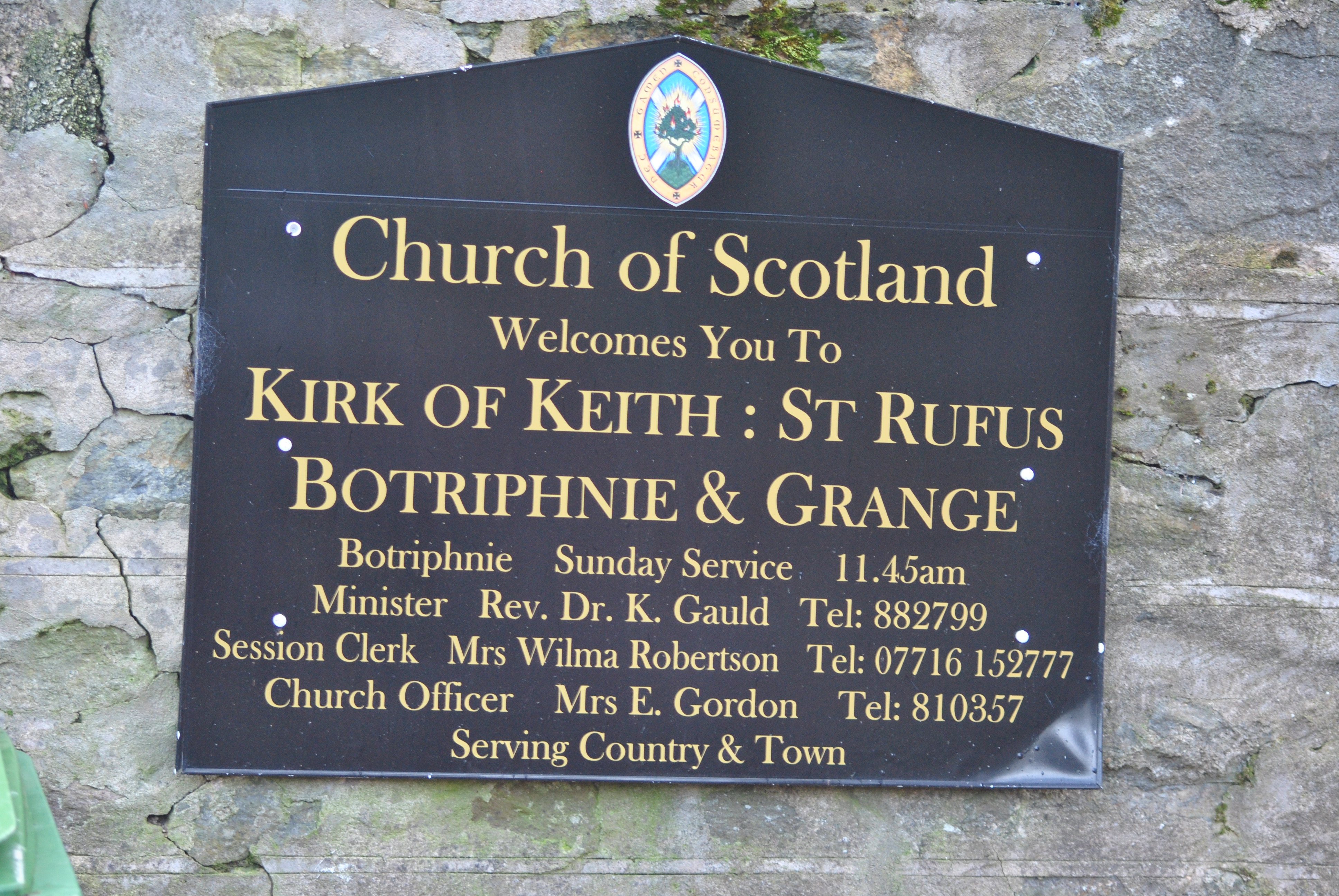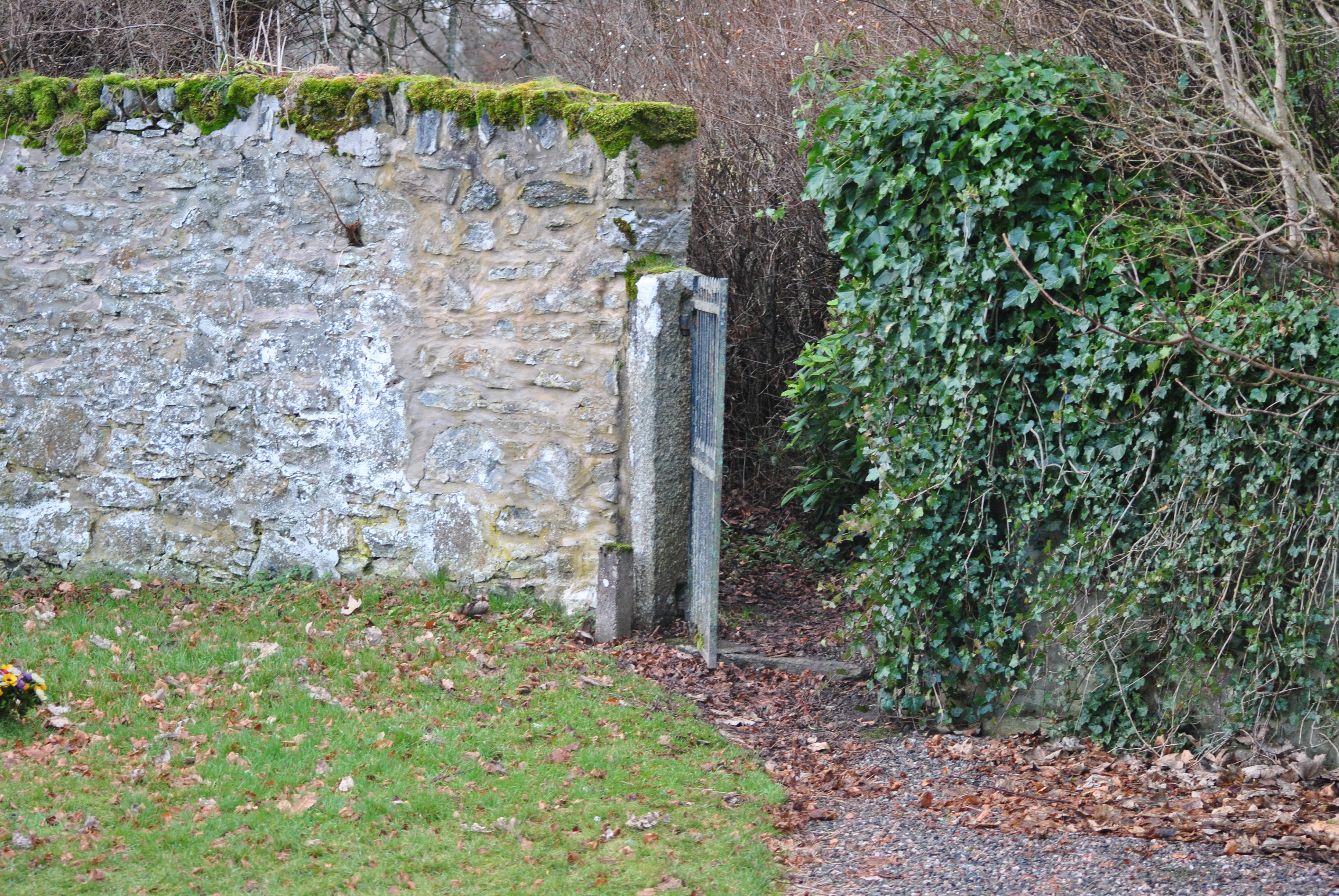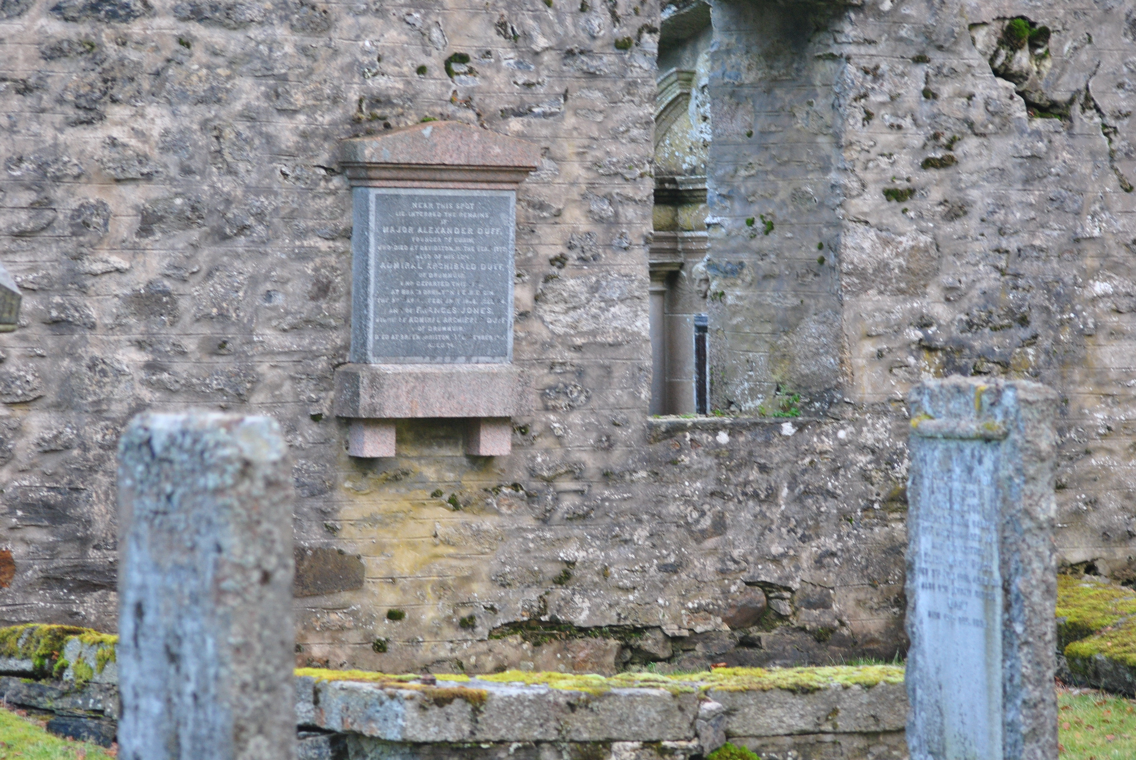 The Gordon-Duffs are buried here. The old church was dedicated to St. Fumac. Not far from the church is the well of Saint Fumac, who is said to have bathed there every morning, no matter what weather. In addition, he is said to have prayed on his knees around the entire Parish boundary to protect the residents from the plague. The well is still bubbling in the garden of the manse.
