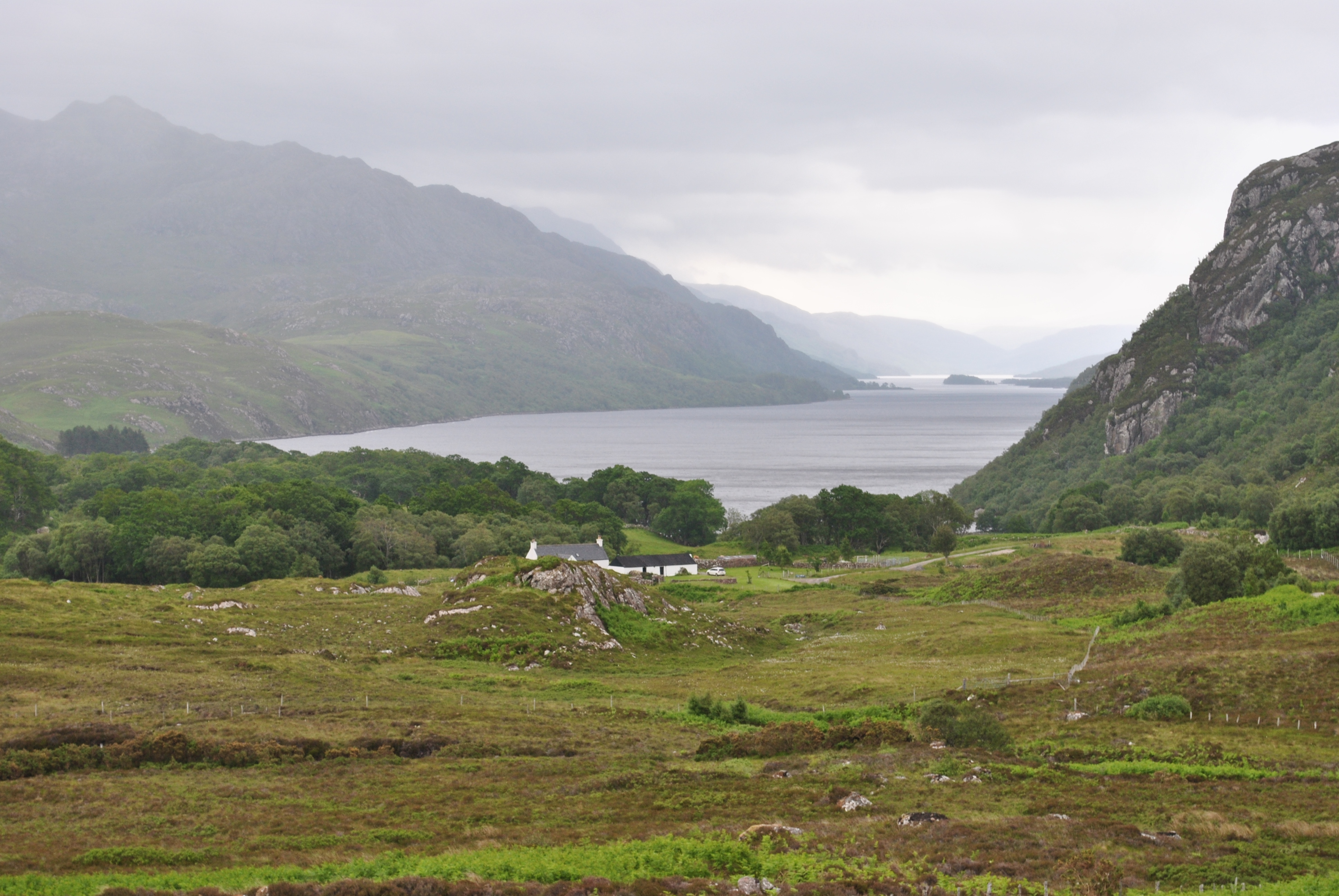 The view of Loch Maree is breathtaking in any weather. Vast mountains enshrine the water’s dark blue that seems to stretch to eternity. The road takes you to Poolewe and further on your way towards Ullapool. The sheer beauty of Scotland’s West Coast is almost unbearably sublime. The grass, green in all its lushness, covers a fertile stretch of land as you approach Gruinard Bay. A village here, a few meadows there, the idyll seems perfect.