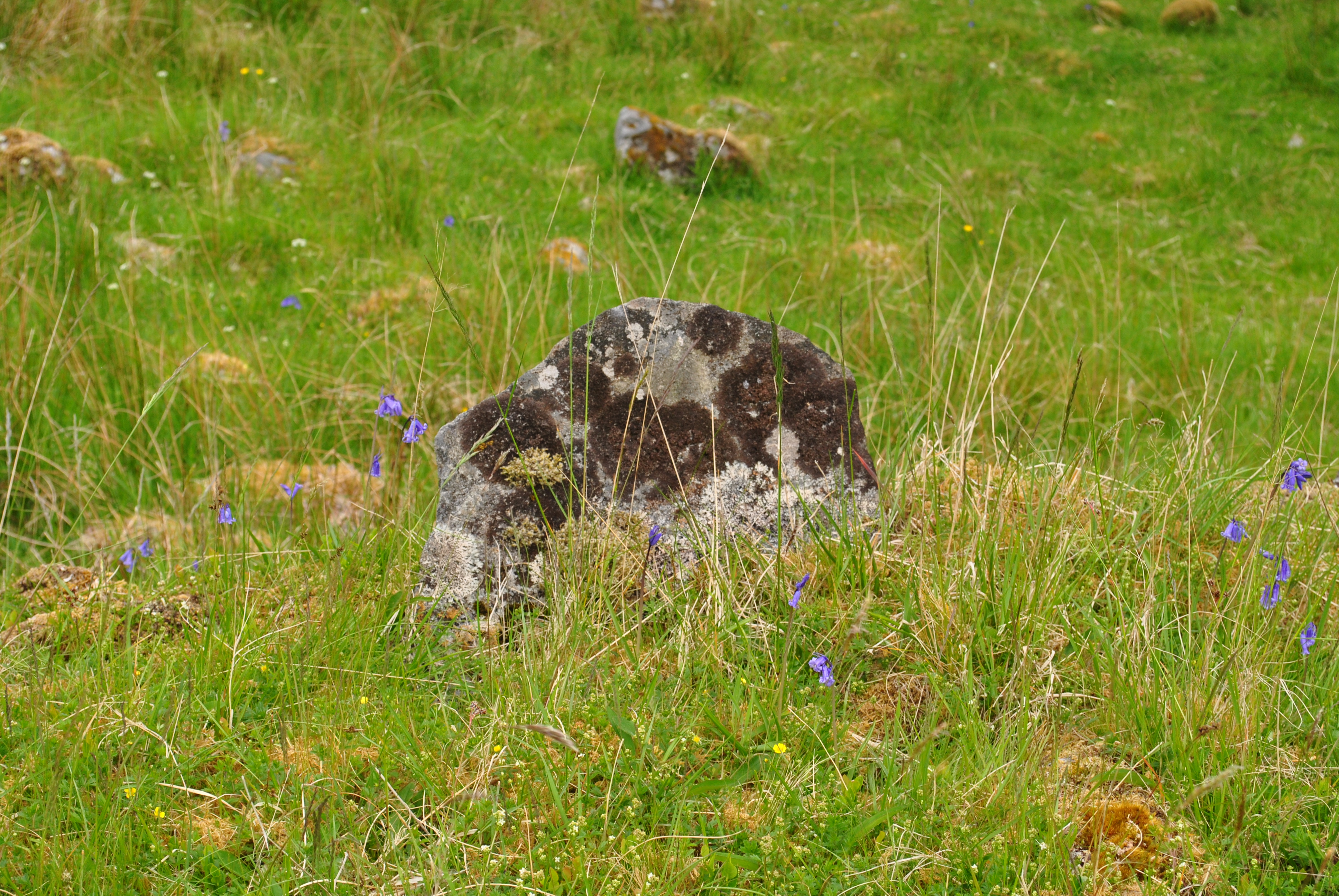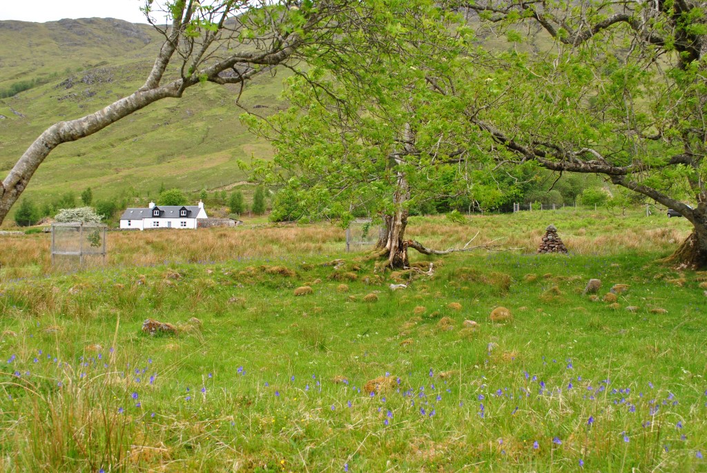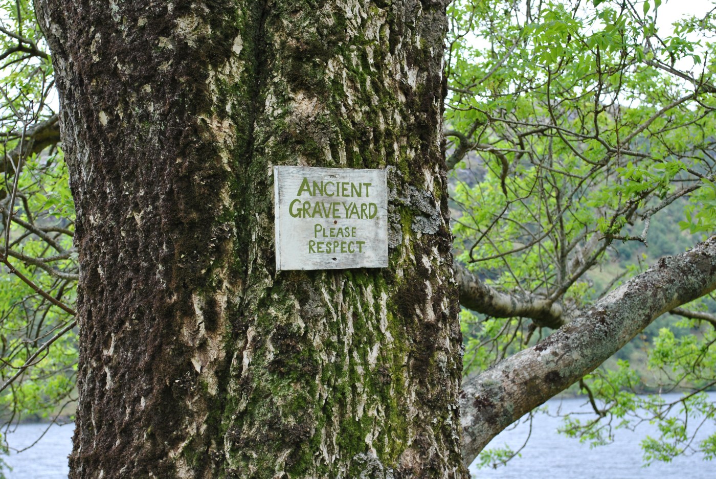 There’s not much left of the ancient graveyard, a few stones possibly marker stones in the past, an overgrown stone wall that could have been an enclosure for graves or for sheep, a giant ash tree bearing the sign: And of course, there is the cairn, erected by Canadian descendants of the MacMillans that once live here and emigrated to Canada after the disastrous defeat at Culloden in 1802.