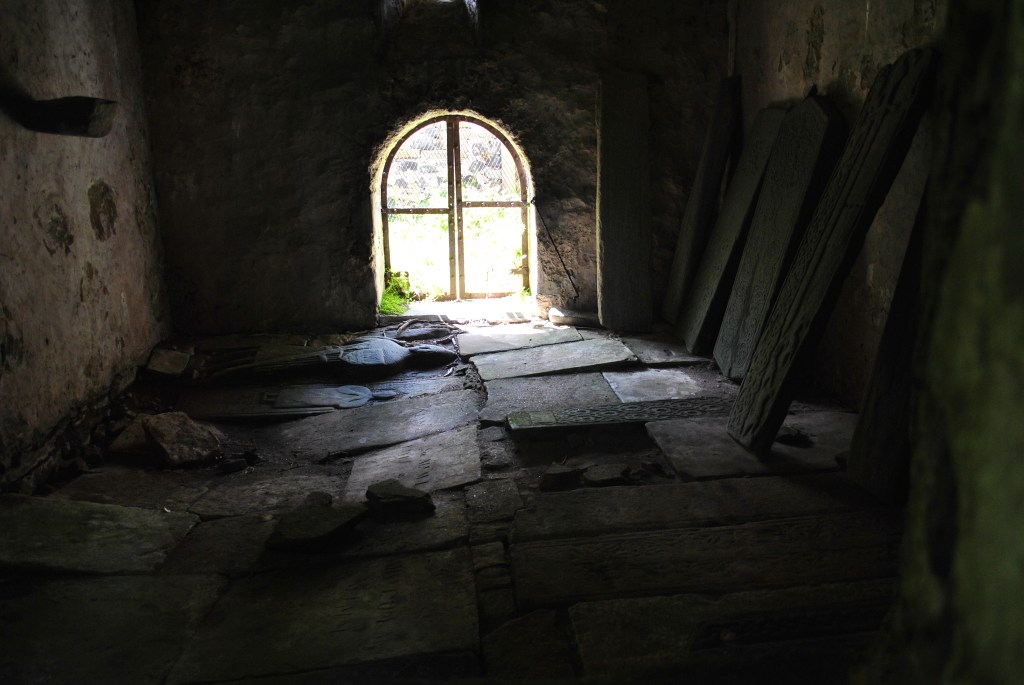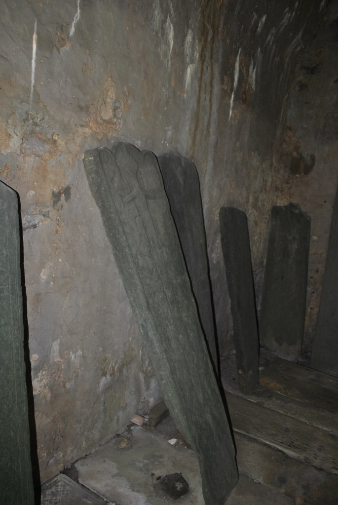 Small windows allow little light and only restricted view of what’s inside: ancient headstones taken from the graveyard into the damp, dark shelter of the vault.
