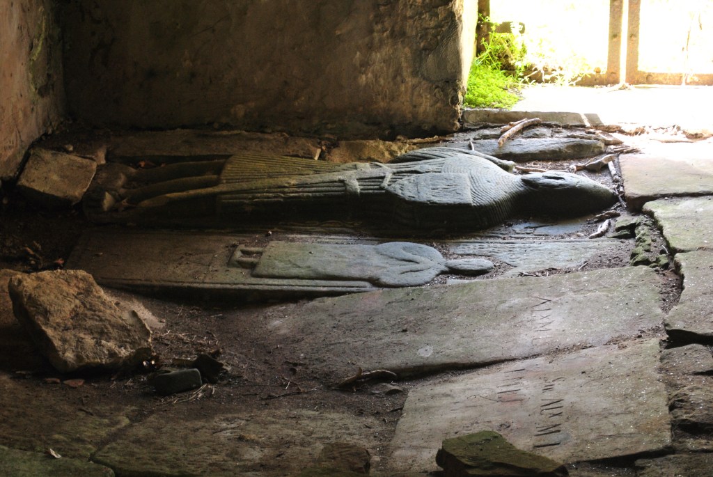 “An Early Christian cross from the site is now in Campbeltown Museum; there are several medieval tombstones set in the north aisle of the church, and several interesting later stones in the churchyard. Three of the medieval stones are illustrated here: the first has a fine sword to one side of the slab with two stems on the other; the inscription which is in Lombardic capitals reads ‘John, Son of Ewan, had this stone made for himself and for his father’. The animal ornament below the inscription contains an unusual collection of beasts: a salmon is being chased by an otter, followed by a stag pursued by hounds. The stone belongs to the Kintyre School and dates to the 15th century. The second stone, of similar date, is a good example of balanced foliaceous patterning round a sheathed sword. The third slab is a beautifully carved example of a fully-armed knight: he has a pointed bascinet (helmet), protective mail covers his shoulder and neck and he wears a long sword with belt fastenings and a ribbed tunic. The stone belongs to the Iona School and is of 14th-15th century date.” (ancientmonuments.uk)