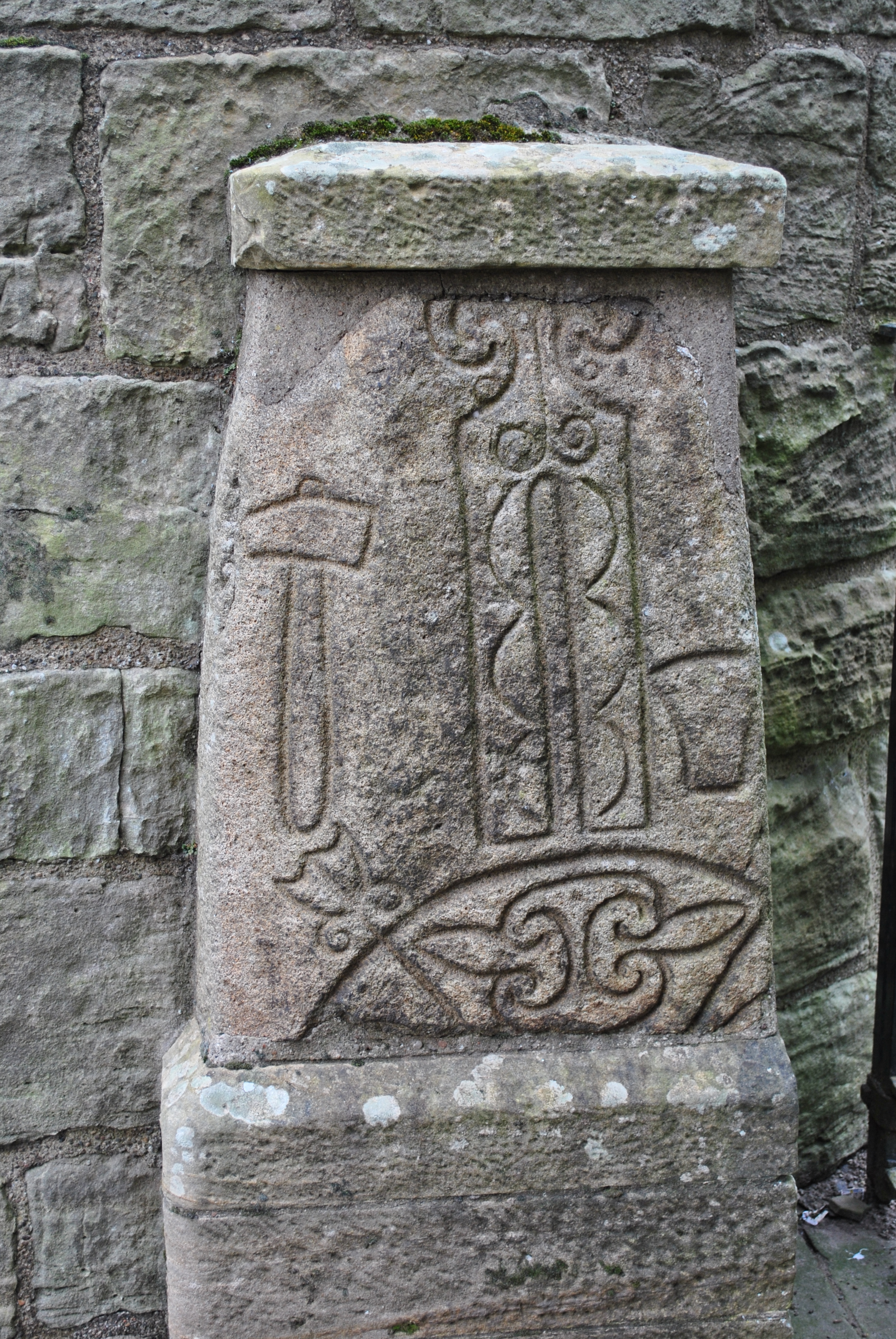 „The Pictish symbol stone mounted on the tower was added in the 1900s. It depicts a hammer and anvil, separated by a ‘tuning fork’ and a crescent and V-rod. The exact meaning of the symbols is unknown.“ (Historic Environment Scotland)