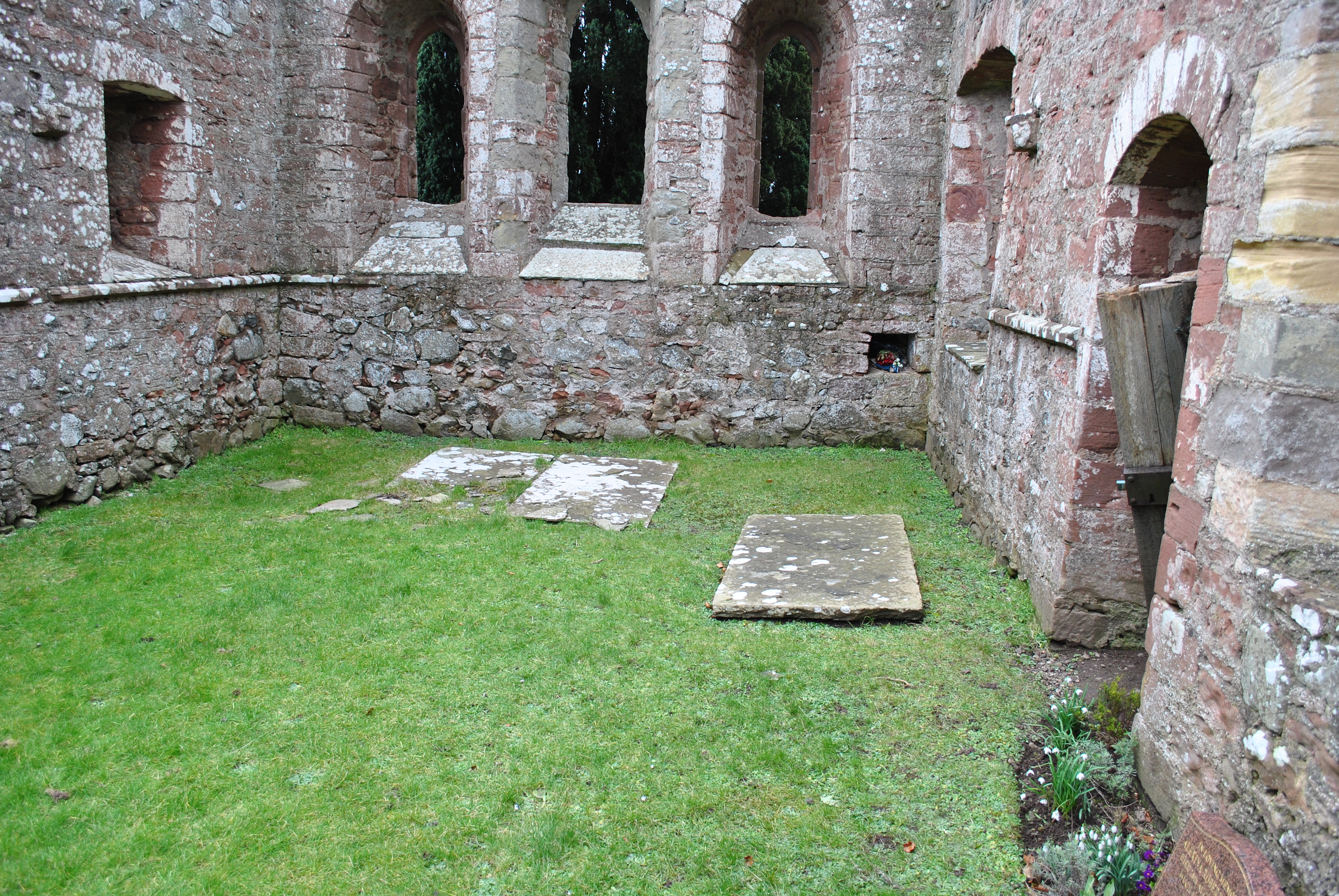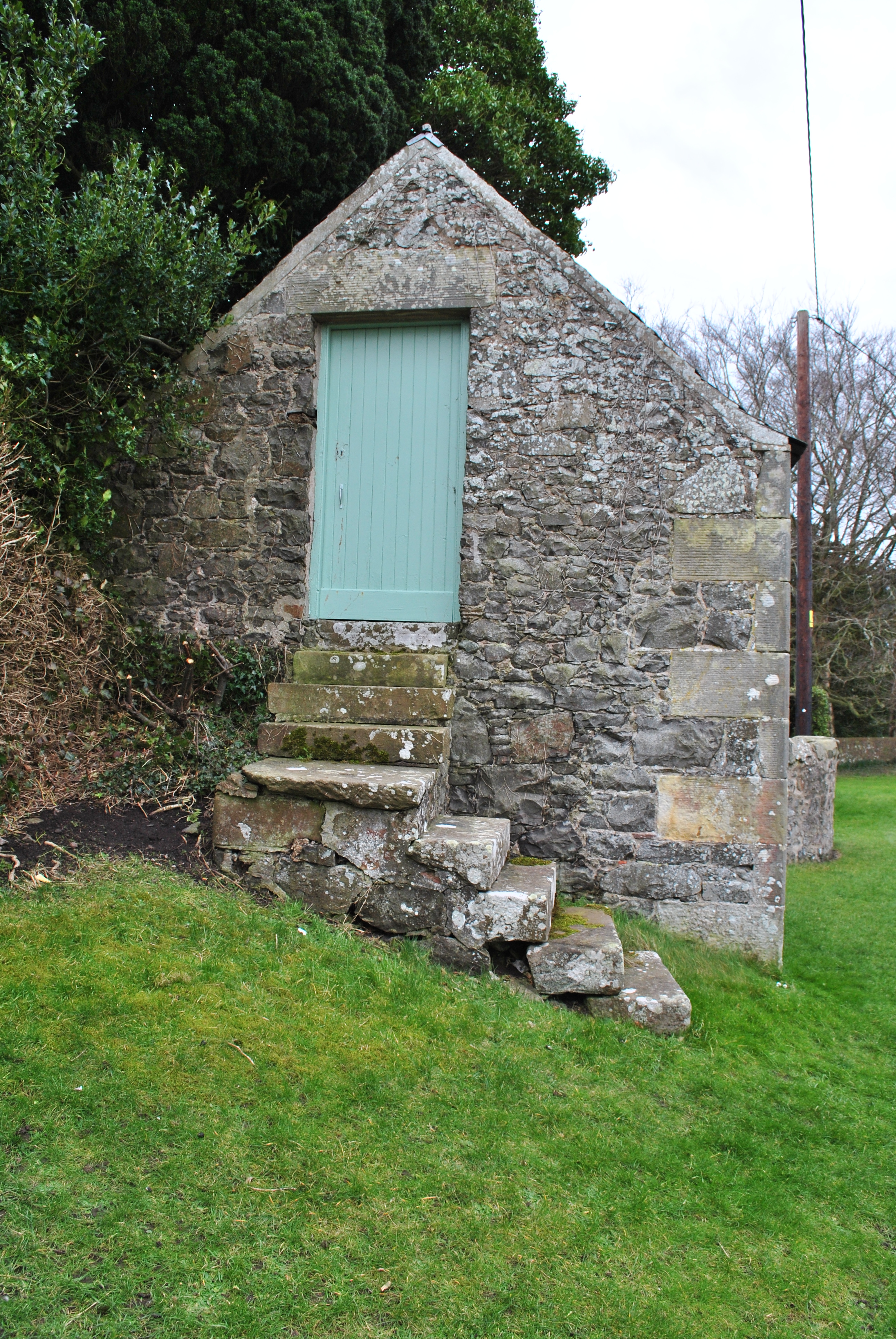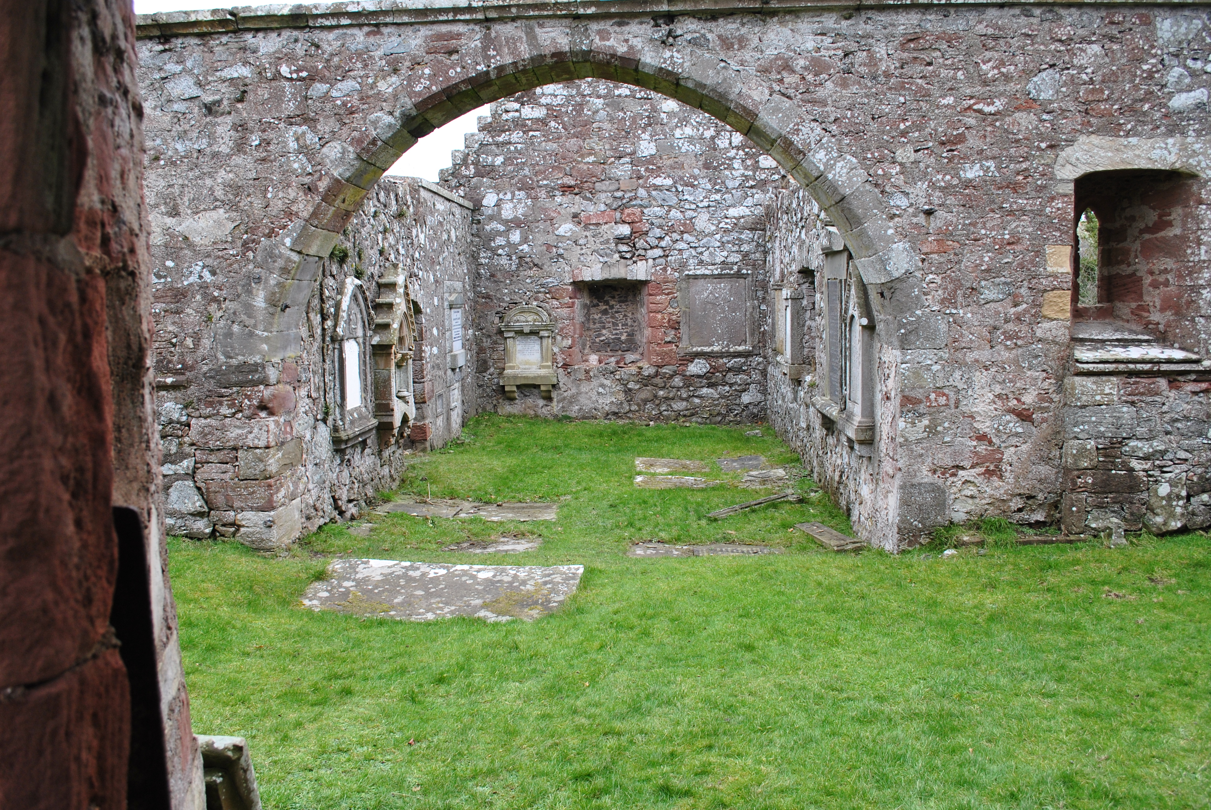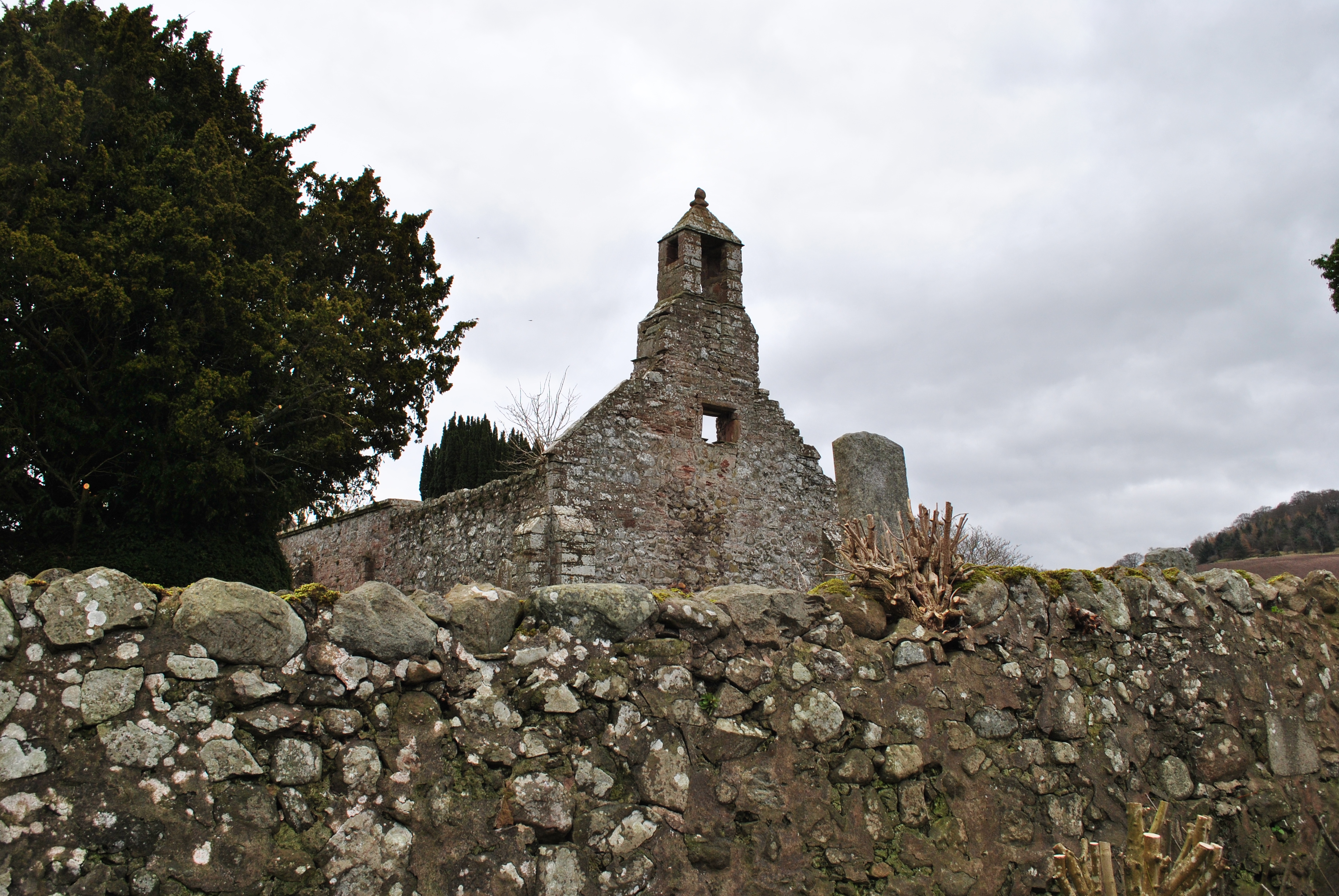 The roofless ruins of St. Magridin’s church stand to the east of a farm lane on a small knoll, surrounded by a graveyard and boundary wall. The site is at the north west of Lindores Loch, where the loch has silted up and become boggy ground. Its east end looks over a gentle slope towards wooded and agricultural land. The church lies east-west and is a long, narrow medieval building. It was built in the 13th century and consecrated in 1242 by Bishop David de Bernham, and then received significant additions in the seventeenth century. It was abandoned in 1827 but restored in 1856. It was eventually replaced by the church at Abdie (site 4674). It is surrounded by a graveyard in which. in common with most medieval churchyards, the majority of memorials are to the south and east of the church. A small building built into the boundary wall was a mort-house which currently contains many carved stones, including ‘Lindores Pictish Stone’ which was moved to the churchyard in 1970. (scottishchurches.org.uk)