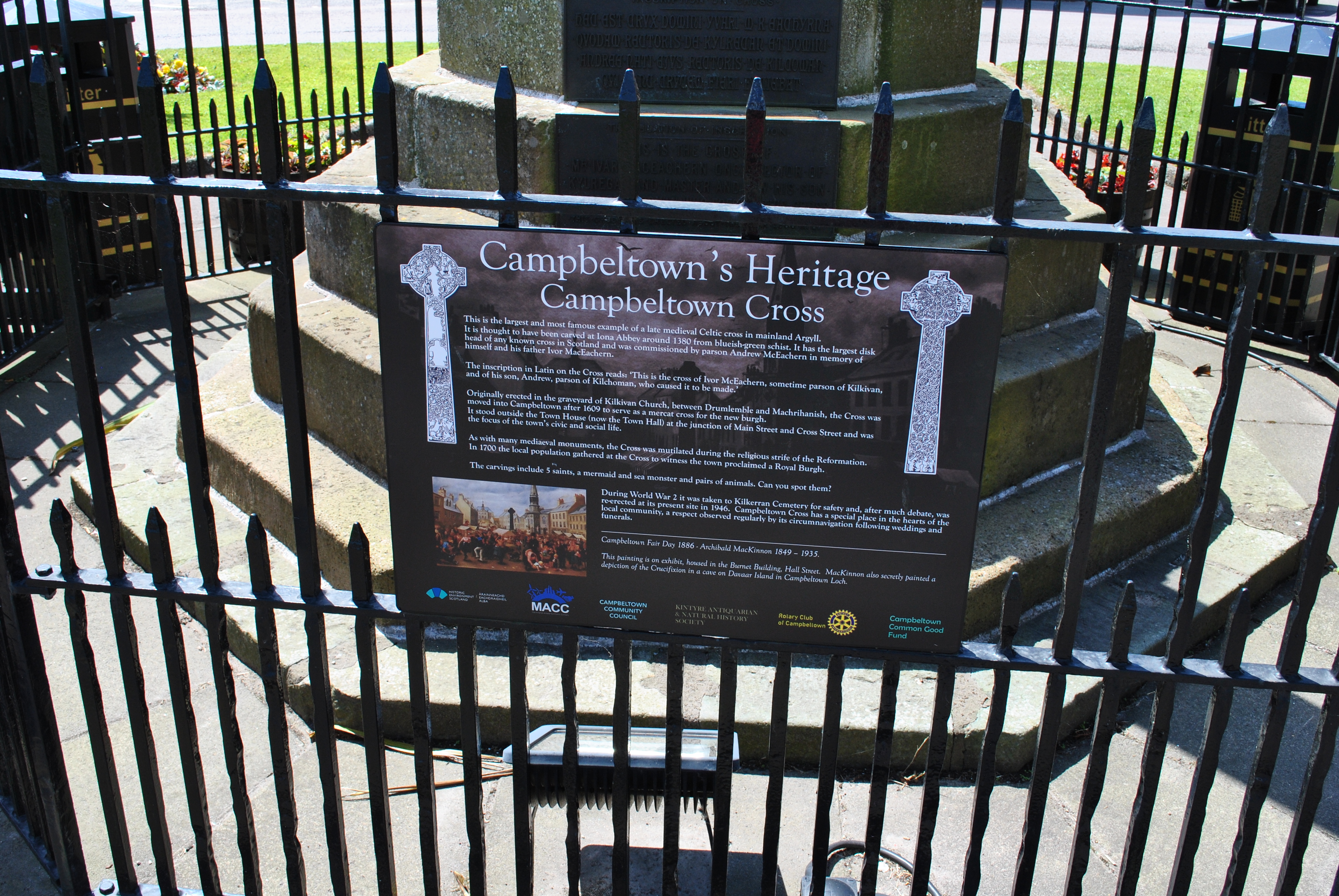 „Campbeltown Cross was brought from Kilkivan Church near Machrihanish to serve as a market cross in 1680. It is the largest and most famous example of a late medieval Celtic cross in mainland Argyll. Dating from circa 1380, it is a work of the highest craftsmanship and merits closer examination because of its intricate Celtic and religious markings. (…)