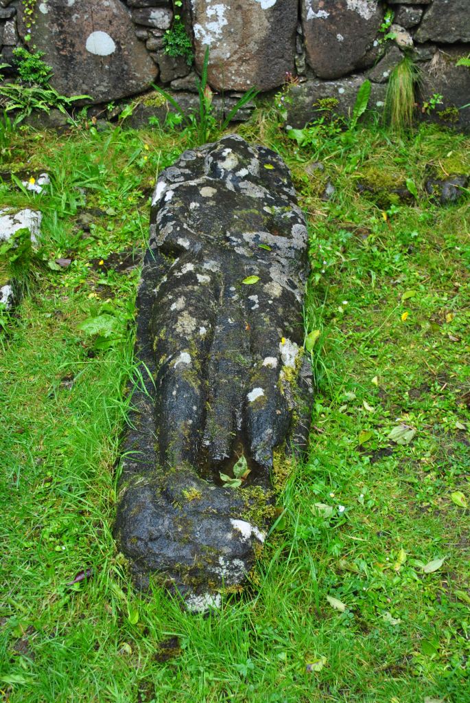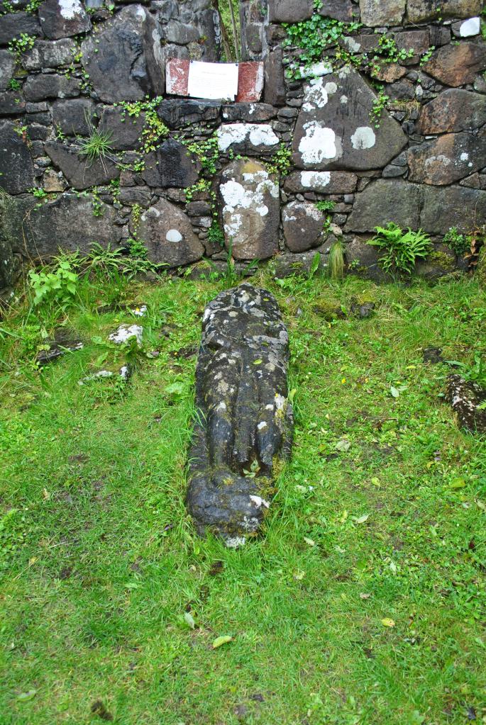 To the west lies the ruin of the older but more intact Chapel/Teampall of St. Columba (also known as Nicolson’s Aisle), possibly contemporary with the original 11th century Episcopal seat here, although an early 13th century date is suggested by an unearthed fragment of an ornamental nook shaft capital identical to work on Iona of that date. Tradition claims that 28 Nicolson chiefs are buried in this mortuary chapel. Of various important carved grave slabs found on the site, a 16th century effigy of a knight still reclines inside. Canmore.org.uk