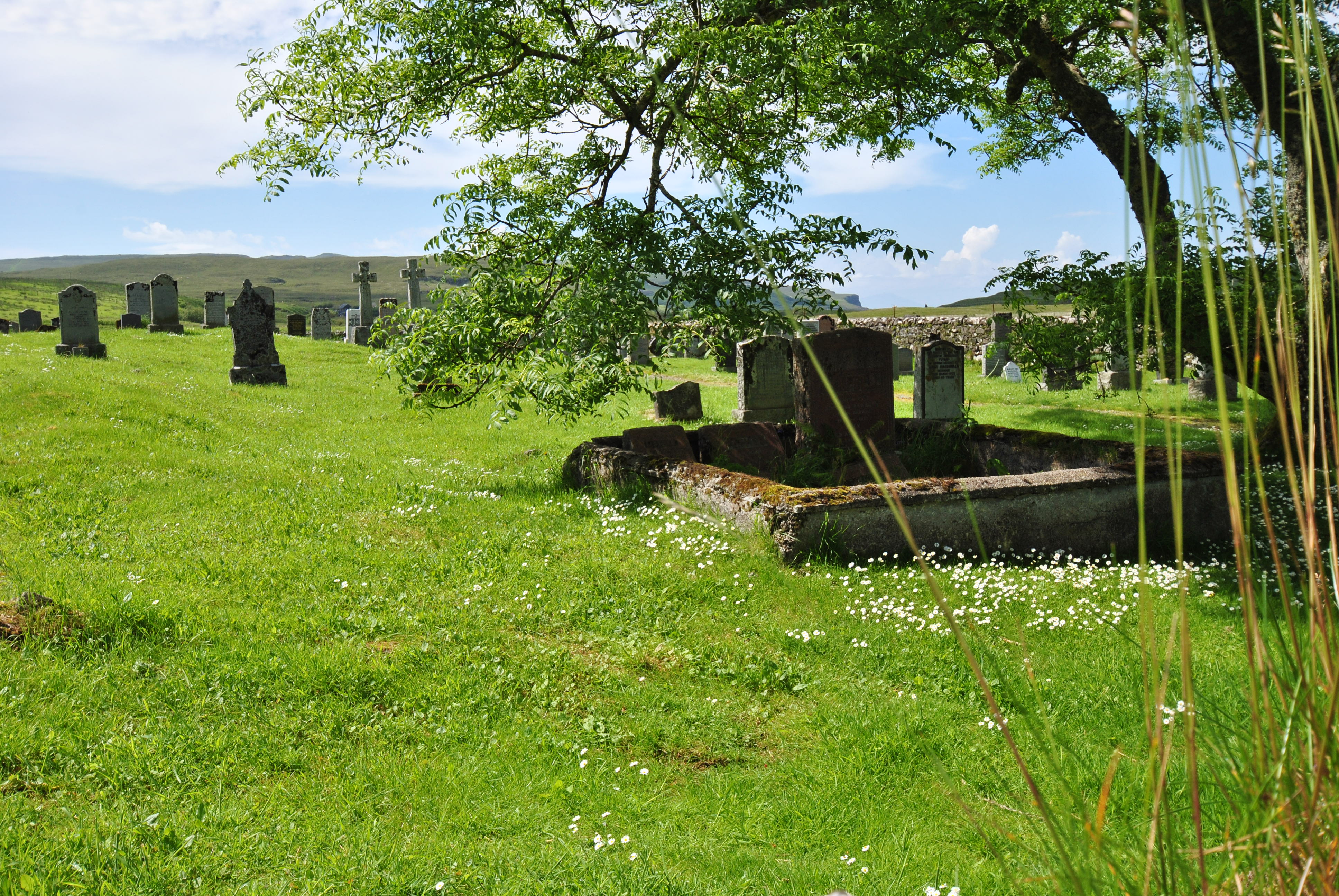 There is no trace of the old church of Kilchoan in Glendale graveyard, which is still in use. The reason the Gaelic Loch-a-Chuain changed to the Gaelic-Norse Loch Pooltiel lies hidden here, in this very graveyard.