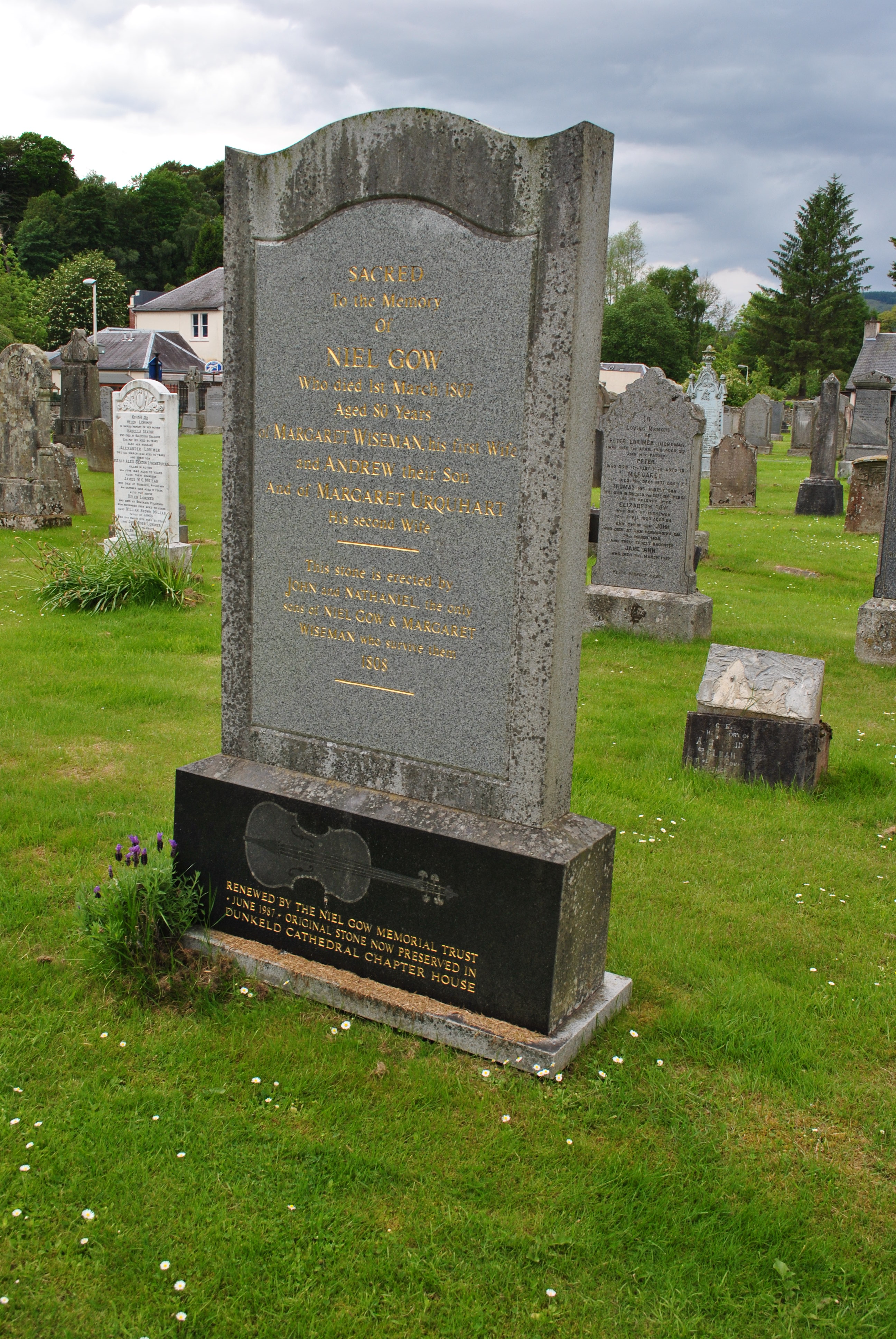 Niel Gow died soon after his second wife, he was 80 years old. His gravestone was taken to Dunkeld Cathedral in 1986, a new one was erected over his grave in Little Dunkeld Churchyard, commemorating the famous Scottish fiddler, both his wives and one of his fives sons.