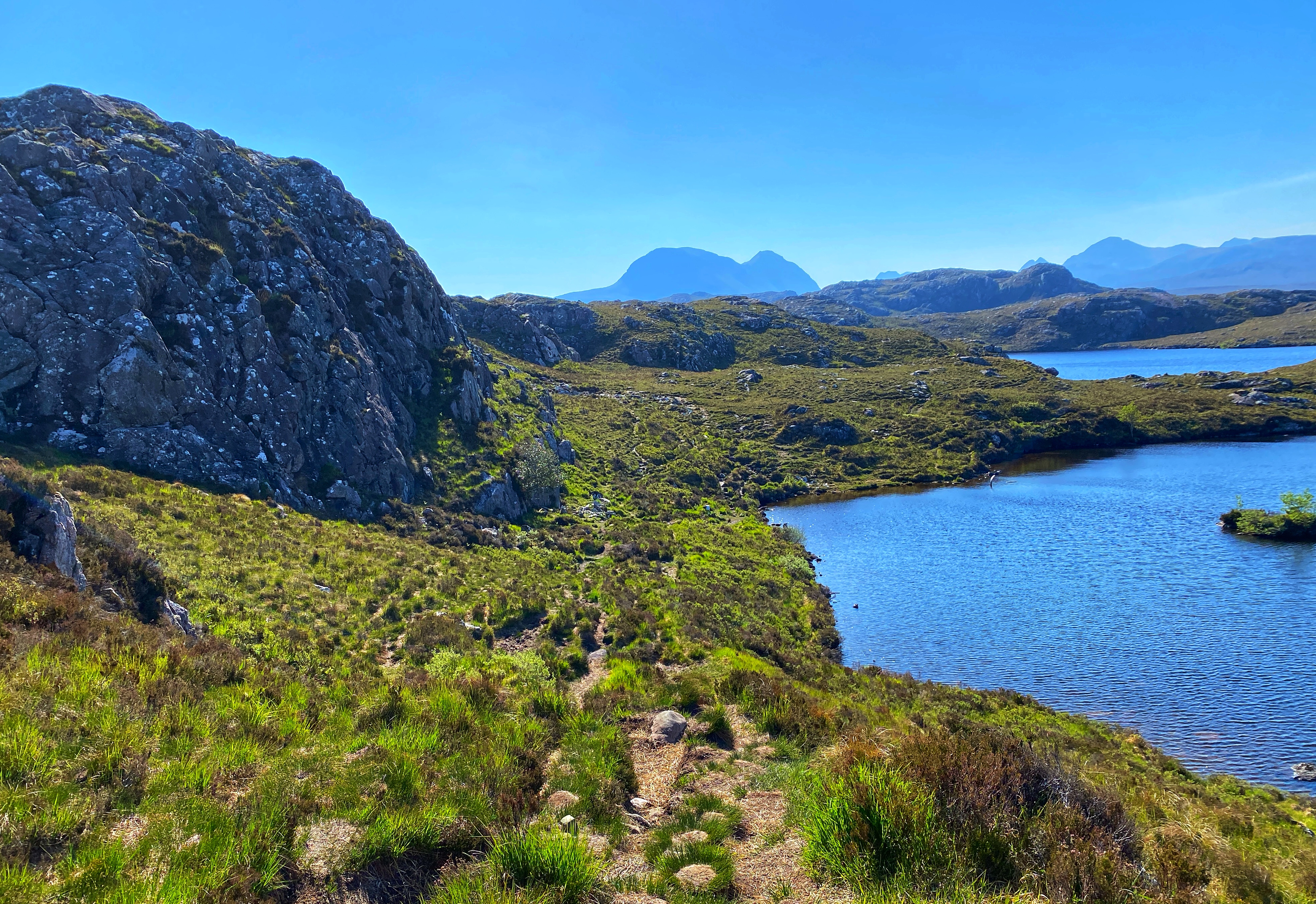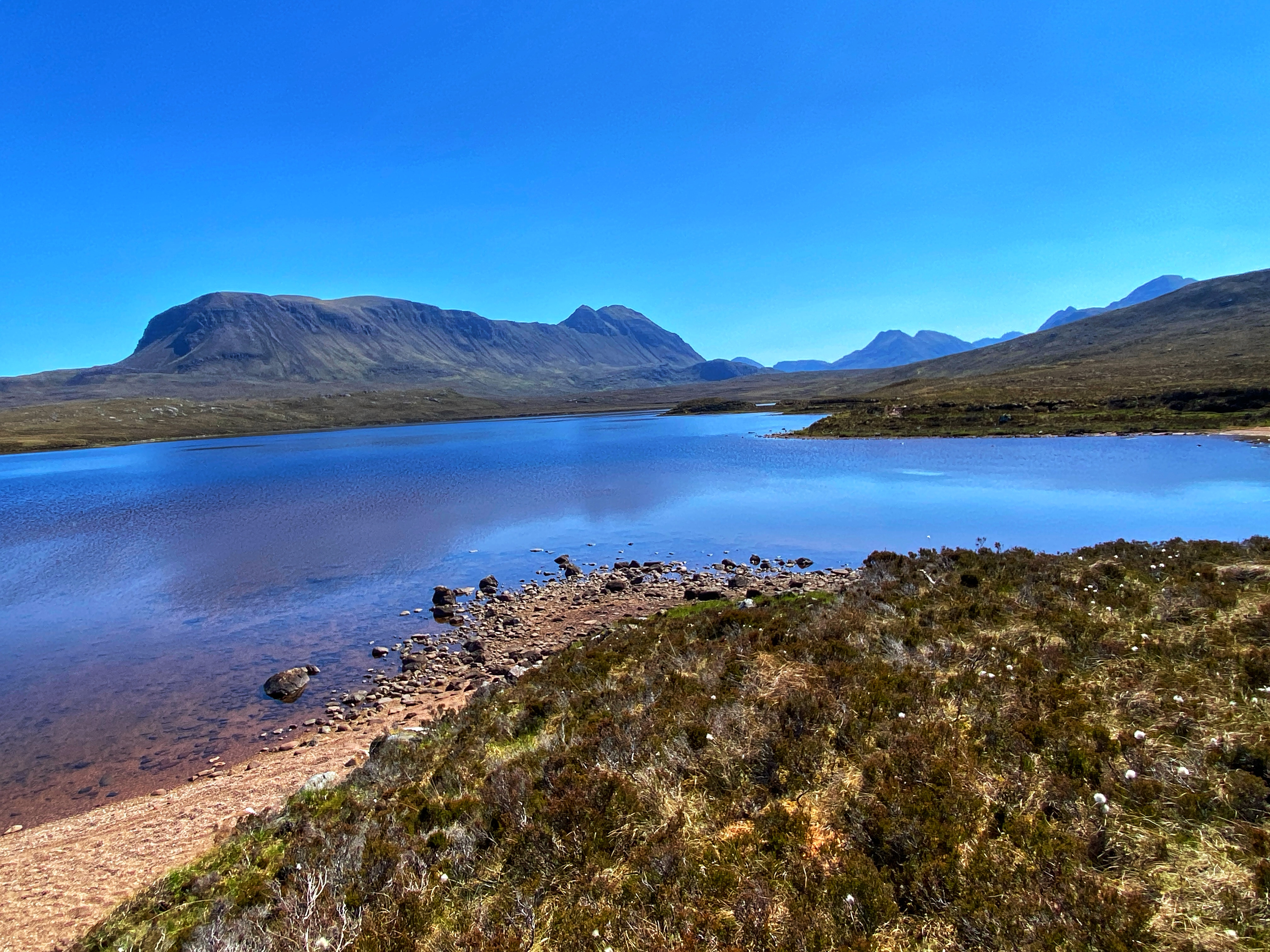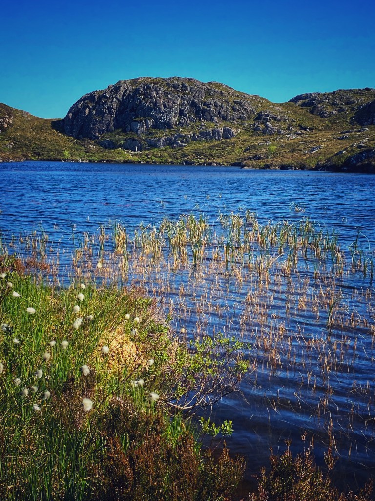 The Fairy Lochs, or Na Lochan Sgeireach in Gaelic, lie just a few kilometres southeast of the village of Badachro. The lochans, set in quiet solitude near the hill Sìthean Mòr – the “Big Fairy Mound” – were given their English name because of this local landmark. Accessible only on foot, across marshy paths and open hillside, the lochs are tranquil, still, and heavy with memory.