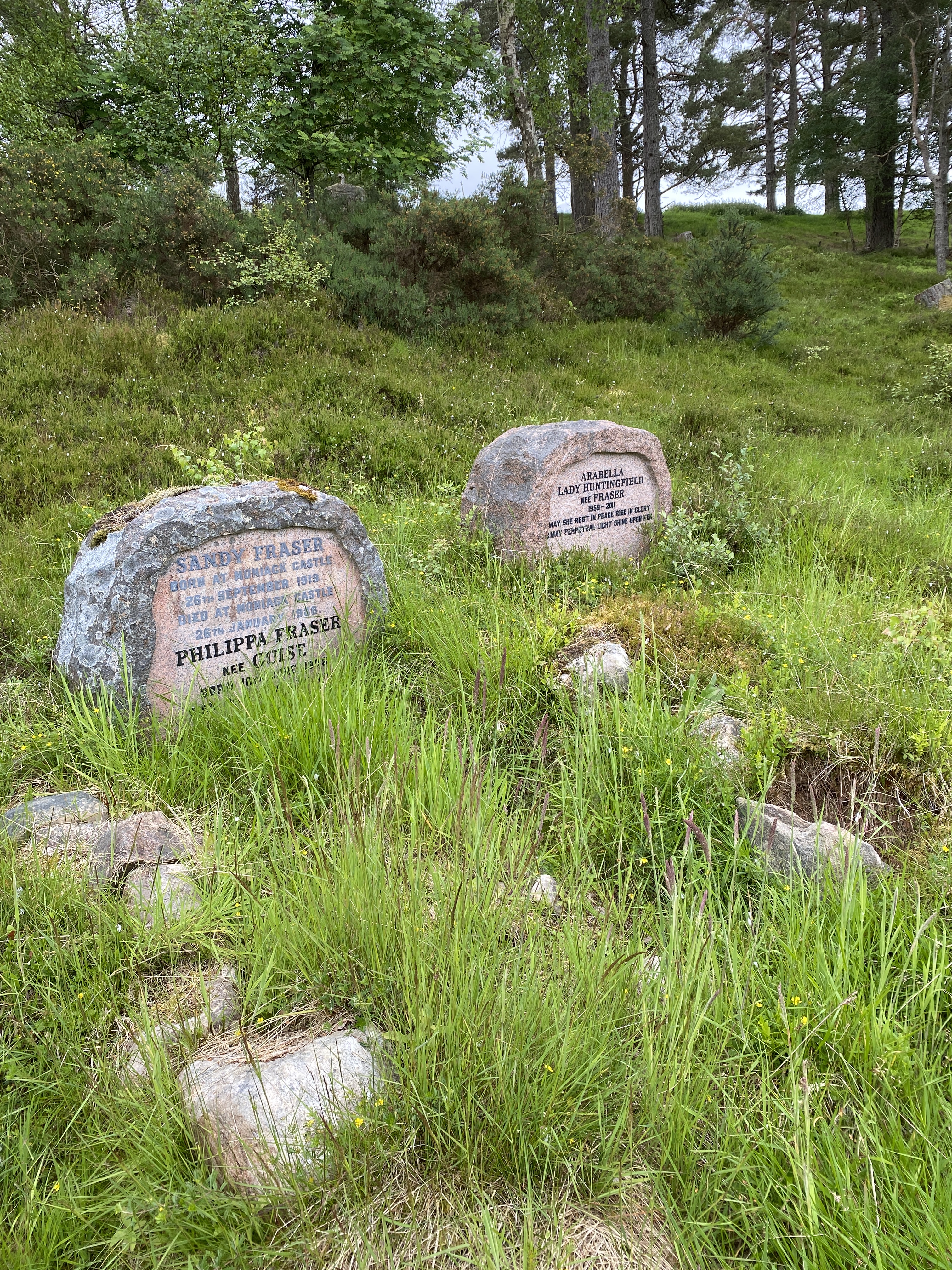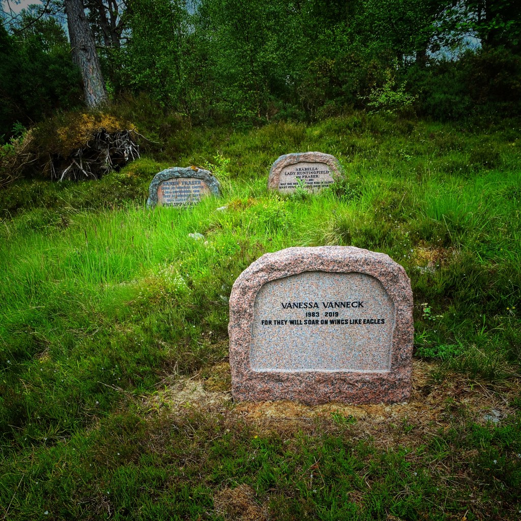 Another grave in the burial ground belongs to Vanessa Clare Vanneck, granddaughter of Major Alastair Fraser and daughter of Arabella Fraser, Lady Huntingfield. Vanessa died in 2019, and her gravestone—simple, elegant, and understated—sits among her Fraser ancestors beneath the trees.
