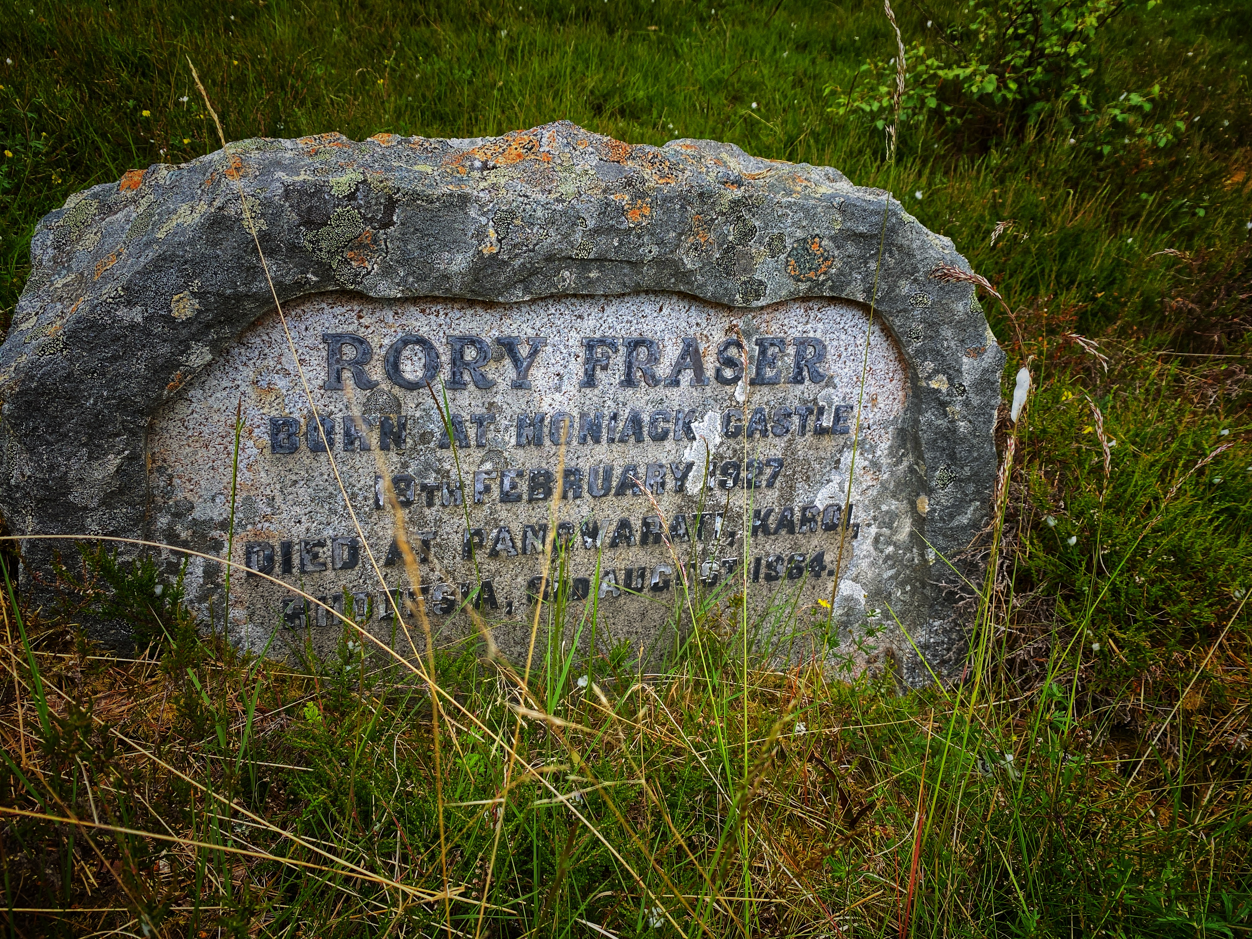 Little is known of Rory’s life, except what the inscription implies: born into Highland aristocracy, he died far from home in Southern Rhodesia (now Zimbabwe), possibly as a farmer or settler. His stone, simple and unadorned, rests quietly beneath the Highland sky.